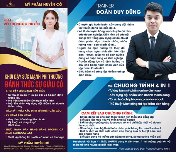 Trong mỗi bạn trẻ, ai cũng tiềm ẩn một sức mạnh phi thường. Nguồn sức mạnh ấy đến từ niềm đam mê, tâm huyết và sự máu lửa trong việc khao khát được thể hiện bản thân và vươn lên làm giàu. Nắm bắt được tâm lý ấy, Mỹ phẩm Huyền Cò đã đầu tư mạnh tay vào chiến lược đào tạo nhằm nâng cao kĩ năng và kiến thức cho nguồn nhân lực, giúp các bạn đủ sức mạnh, chinh phục giấc mơ phú quý của cuộc đời mình.