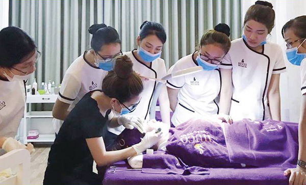 Tổng giám đốc Huyền Cò hướng dẫn nhân viên kỹ thuật chăm sóc da nám